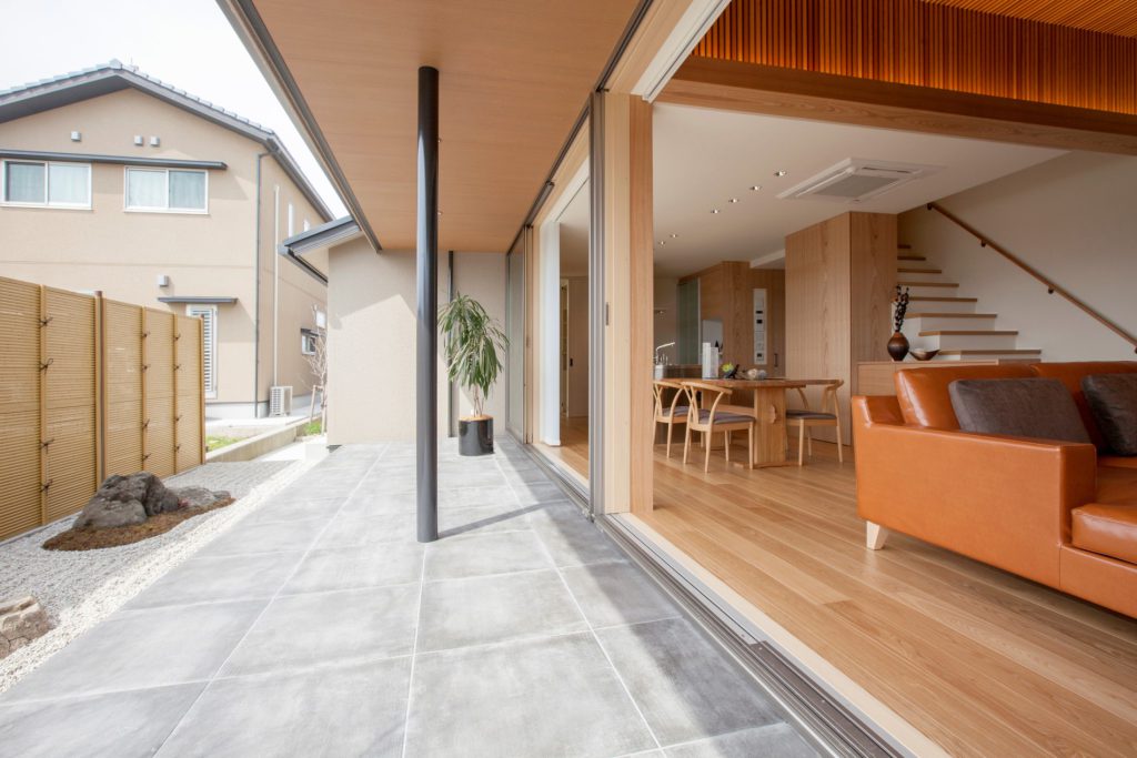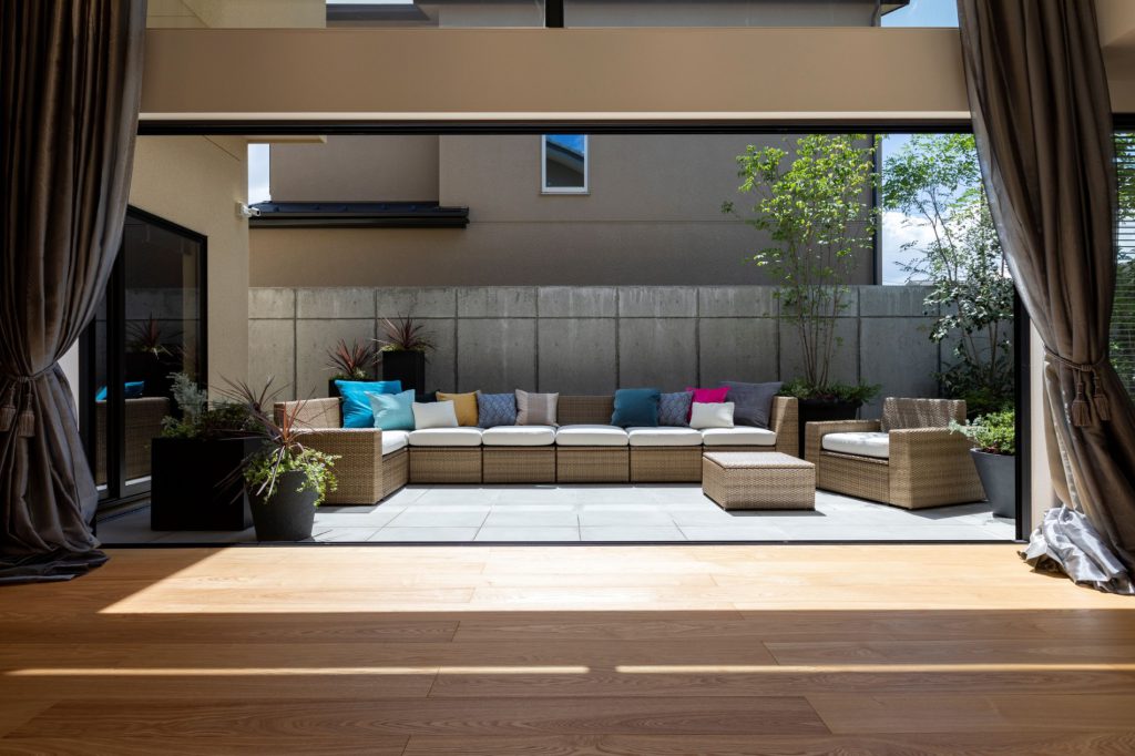 テラスのメリットは、リビングの延長として広々と空間を使えることです。 リビングとつながるようにテラスをつくり大きな窓を設けることで、リビングとテラスが一体化しているように見え、開放感のある空間を演出できます。