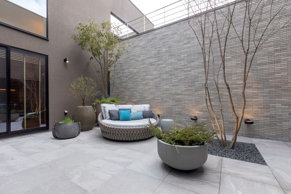 「テラス」とは、リビングなどの室内から続く外のスペースで、室内と一体化して様々な使い方ができます。プライバシーを保ちながら屋外空間を楽しめるのも特徴です。広さは、約2~3坪くらい(4~6帖程度)が一般的で、木材や土間コンクリート、石材・レンガ、タイルなどの床材で仕上げられます。