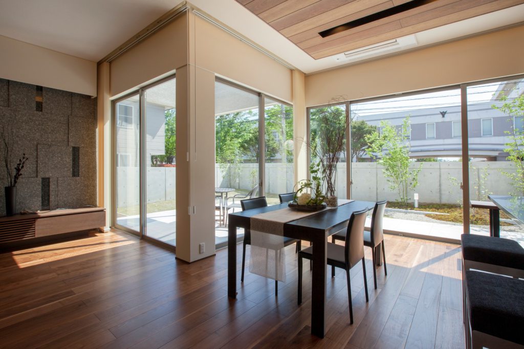 テラスを設けるメリットの一つとしてあるように、リビングとテラスを大きな窓でつながるようにすれば空間全体が一体化し、視覚的な広がりを演出できます。より効果的に広がりを見せるためには、テラスとリビングの床や建具、天井の色・素材などを合わせるのがおすすめです。 室内外の境目が曖昧になることで視覚的に連続し、実際の空間よりも広がりがあるように見えます。